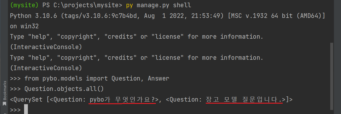 Question 모델을 다시 임포트한 후 Question 모델 데이터를 조회하기.
