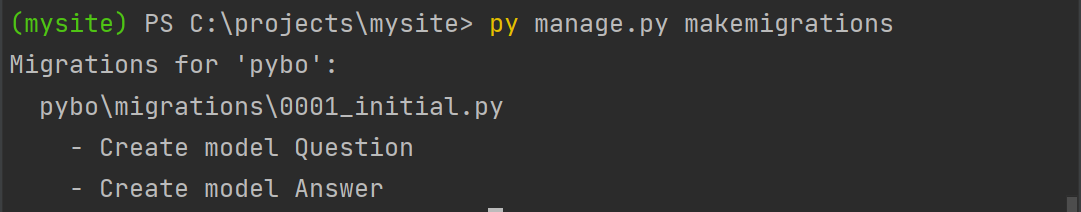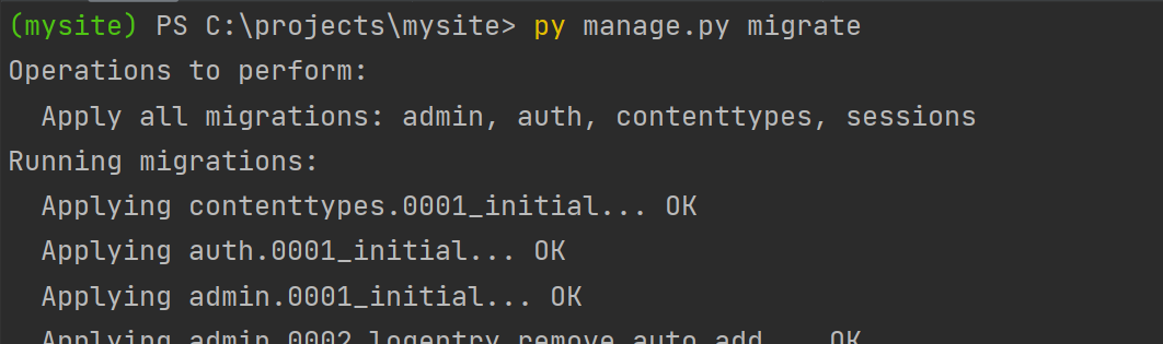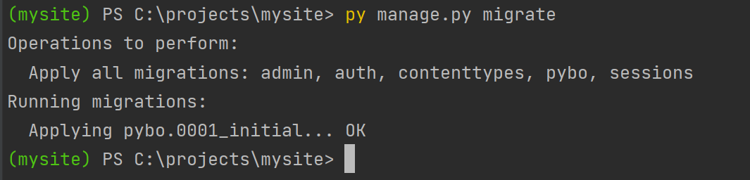 명령 프롬프트/ 터미널 에서 py manage.py migrate를 입력했다.