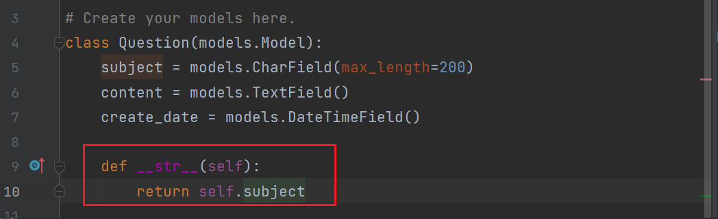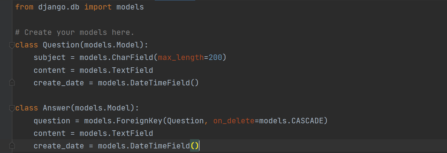 Question 모델에는 제목(subject), 내용(content), 작성일시(create_date)를 속성으로 추가했다.